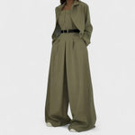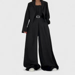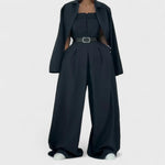 Charakteryzuje się ultra-modnymi spodniami o szerokich nogawkach, strukturalnym bustierem i dopasowanym, zwiewnym żakietem, zaprojektowanym tak, aby podkreślać każdą sylwetkę.
