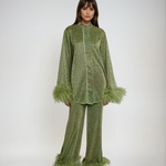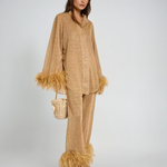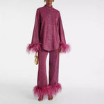 Ten elegancki zestaw, składający się z długiego rękawa z kołnierzem ozdobionym piórami oraz spodni o luźnym kroju, łączy w sobie ekskluzywne detale projektowe z maksymalnym komfortem. Idealny na jesień i zimę, ten strój emanuje stylem i wszechstronnością.