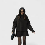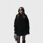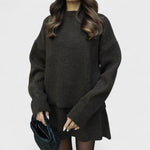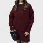 Idealny zestaw dzianinowy na chłodniejsze dni. Miękka i ciepła tkanina, luźny krój oraz ponadczasowa prostota sprawiają, że ten zestaw jest niezbędny. Sweter z okrągłym dekoltem i pasujące spodnie tworzą elegancką i wygodną całość, idealną do relaksu w domu lub na wyjście do miasta.