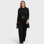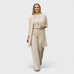 Trzyczęściowy design: żakiet, top i dopasowane spodnie dla pełnej elegancji.