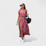 Ta sukienka w kwiatowy wzór z dekoltem w serek to idealne połączenie komfortu i stylu. Idealna na spacery, letnie wieczory lub luźne wyjścia z przyjaciółmi, jej wszechstronny design i lekki materiał czynią ją niezbędnym elementem na ten sezon.