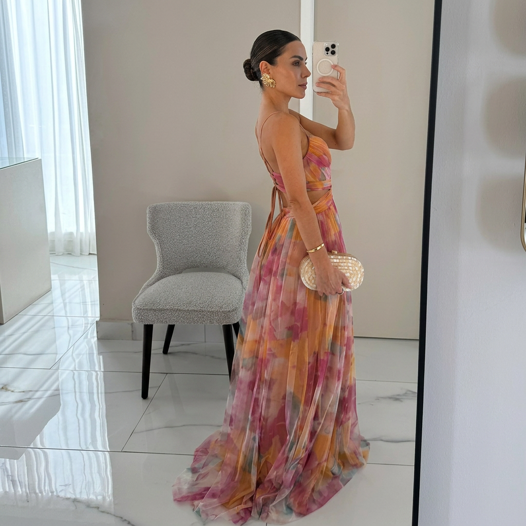 Najbardziej pożądana sukienka wraca — ale tylko na ograniczony czas. Sukienka Margarida zdobyła serca setek kobiet i za każdym razem, gdy wraca, rozmiary wyprzedają się w ciągu kilku dni. Wykonana z lekkiego i oddychającego szyfonu z wbudowaną podszewką, elegancko podkreśla sylwetkę. Kwiatowy wzór nadaje jej romantyczny i nieodparty urok, co sprawia, że jest idealna na każdą okazję — od dnia w mieście po specjalną noc.